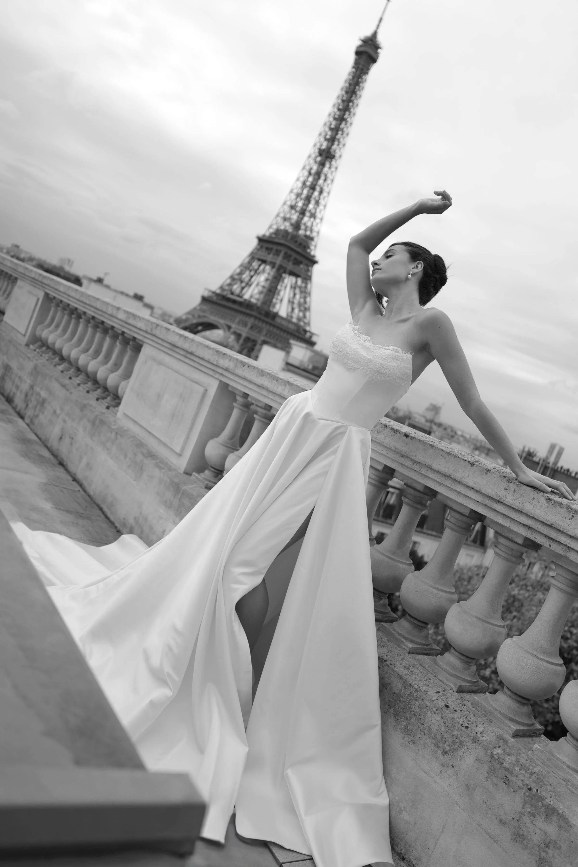 Crafted in our signature Mikado, Haven features a soft scoop neckline framed by delicate Chantilly lace that drapes over the bust. The modern basque waist, defined by angled seams, sculpts and flatters the silhouette before flowing into a clean A-line skirt with a split. Finished with fabric buttons that trail to the end of the train, Haven is the perfect gown for the bride who cherishes the finer things in life.