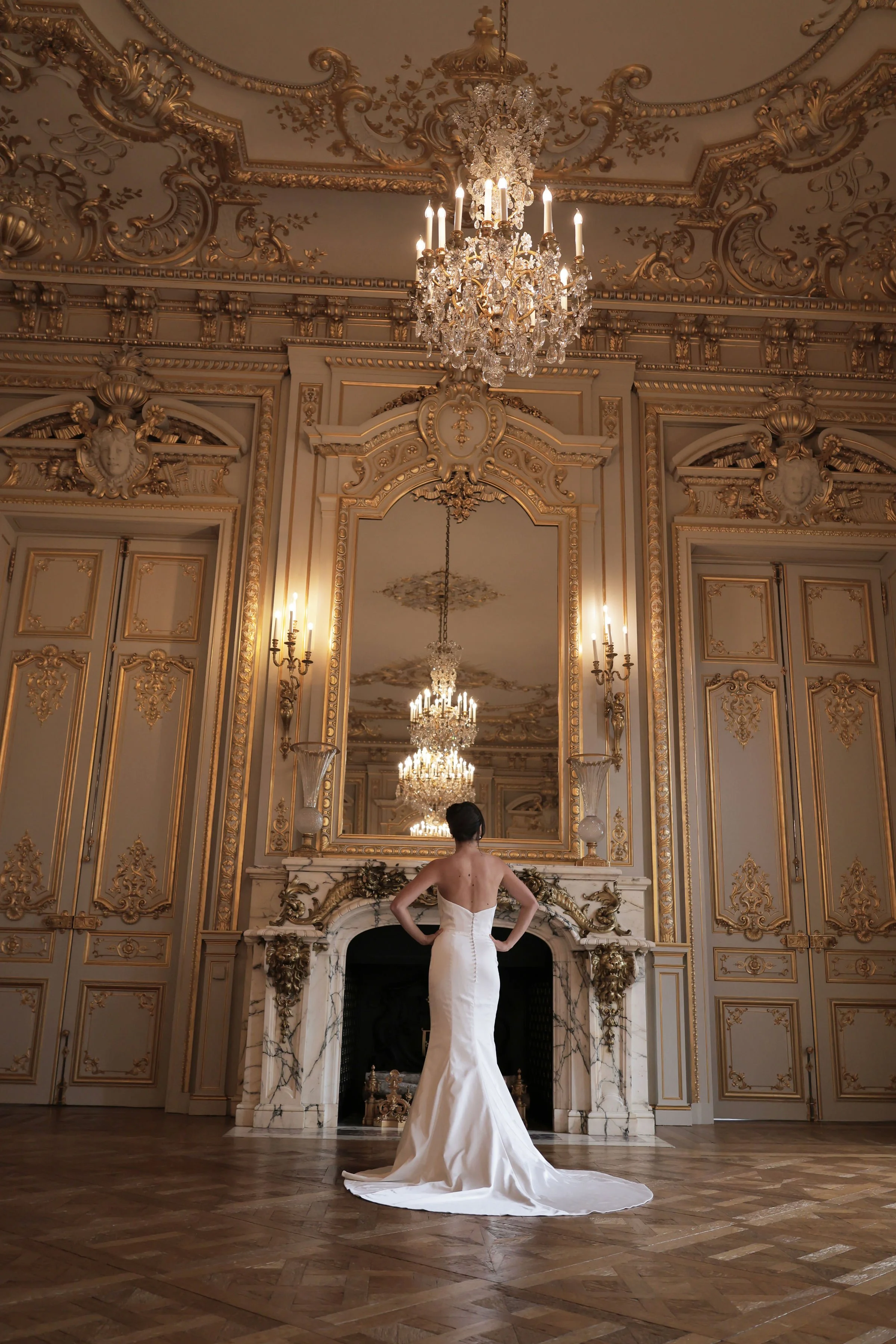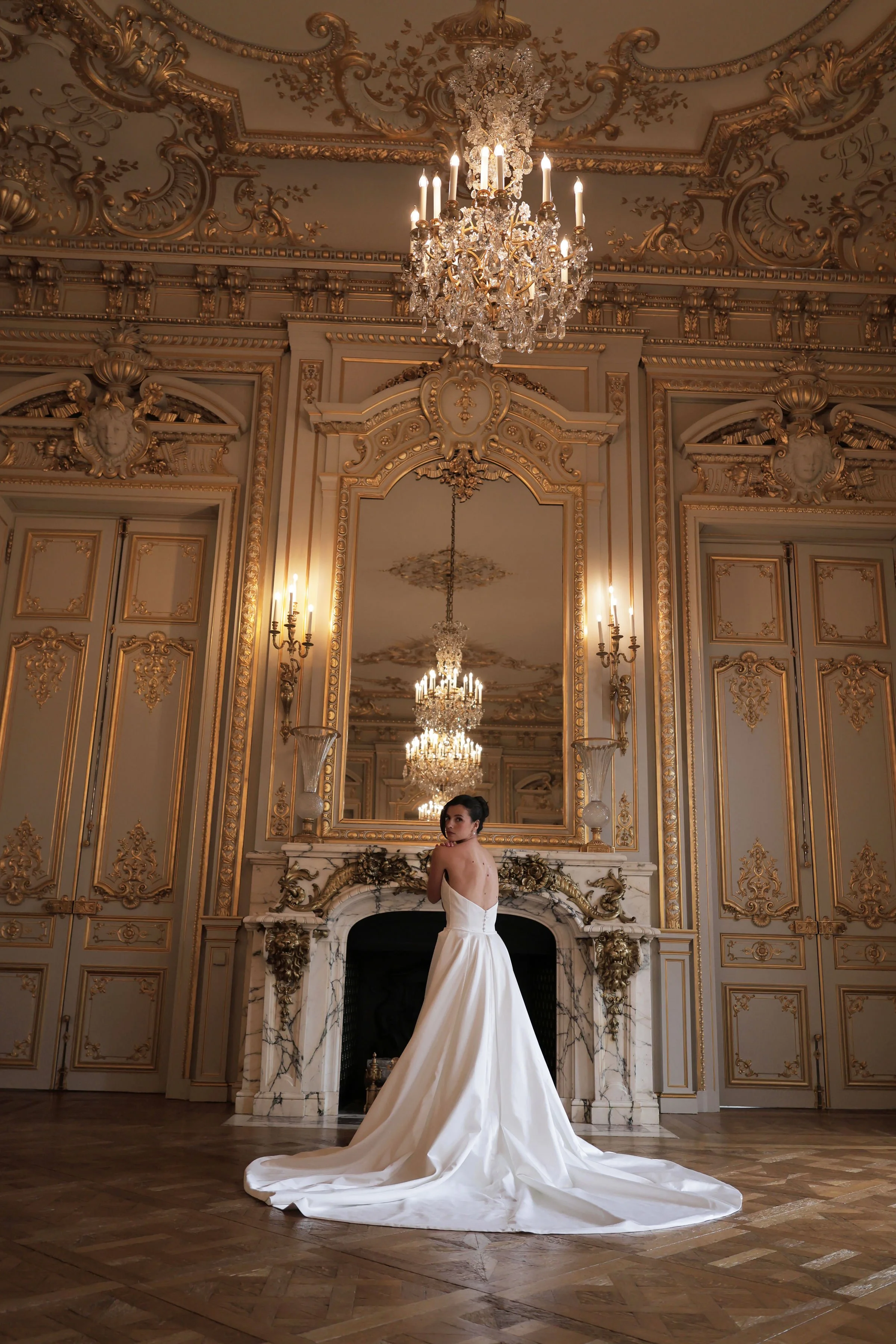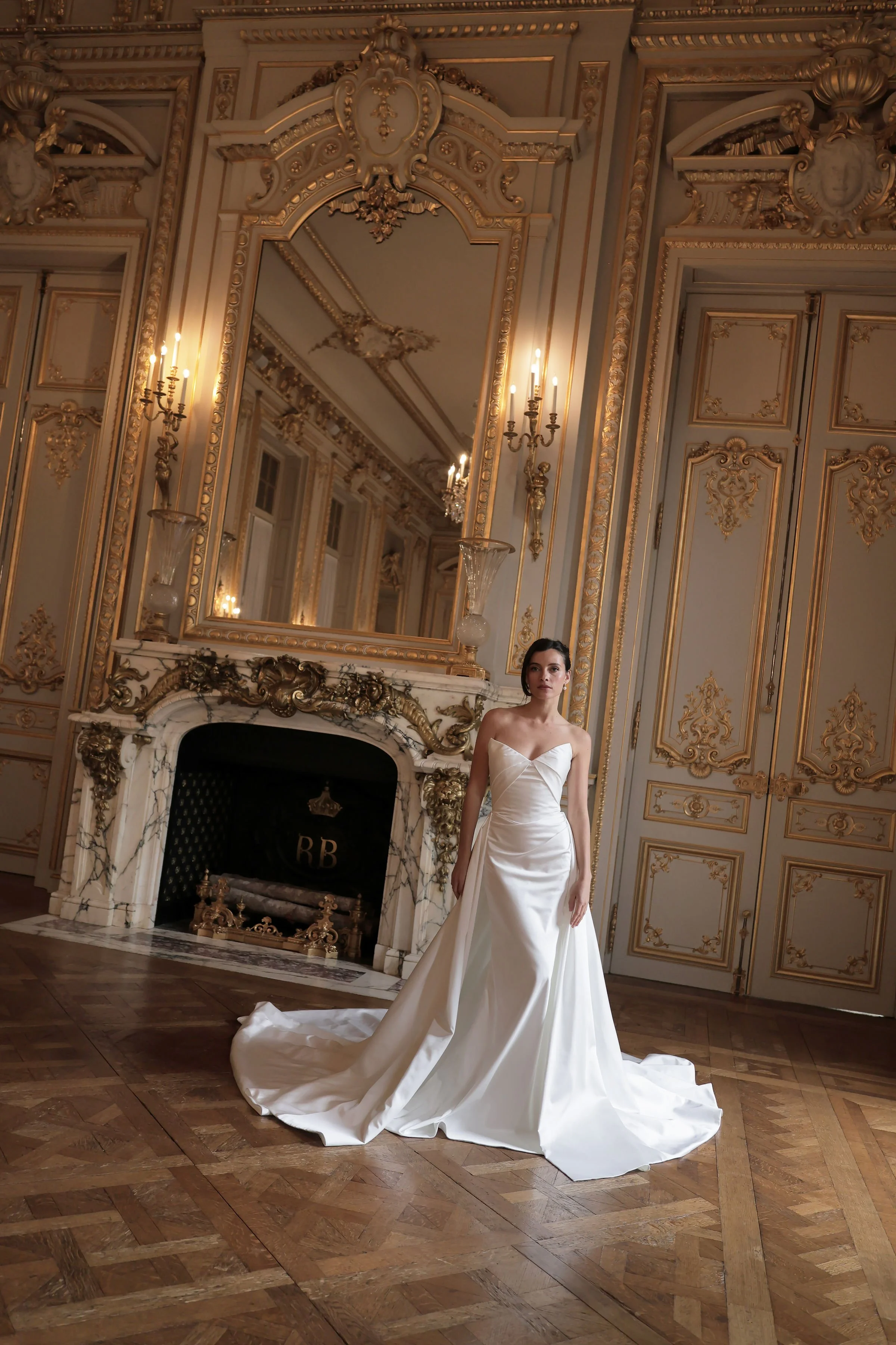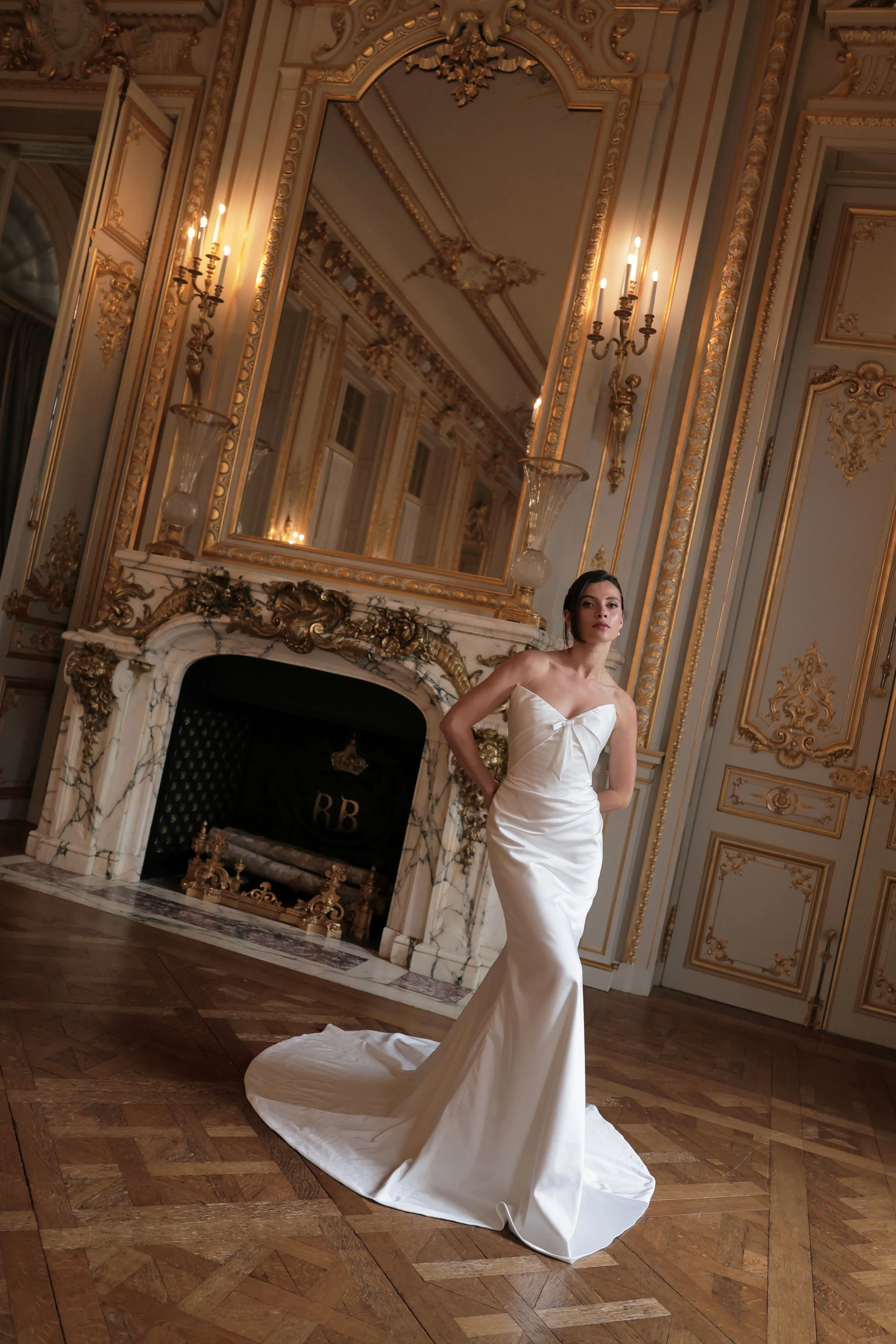Crafted in luxurious satin, Valentina is a fitted gown designed to flatter, with soft ruching that contours the skirt. The bodice features fabric folds that frame the strapless neckline, creating a clean yet striking focal point. A detachable white bow adds a refined touch, while the optional overskirt allows for a seamless transition from ceremony to reception.